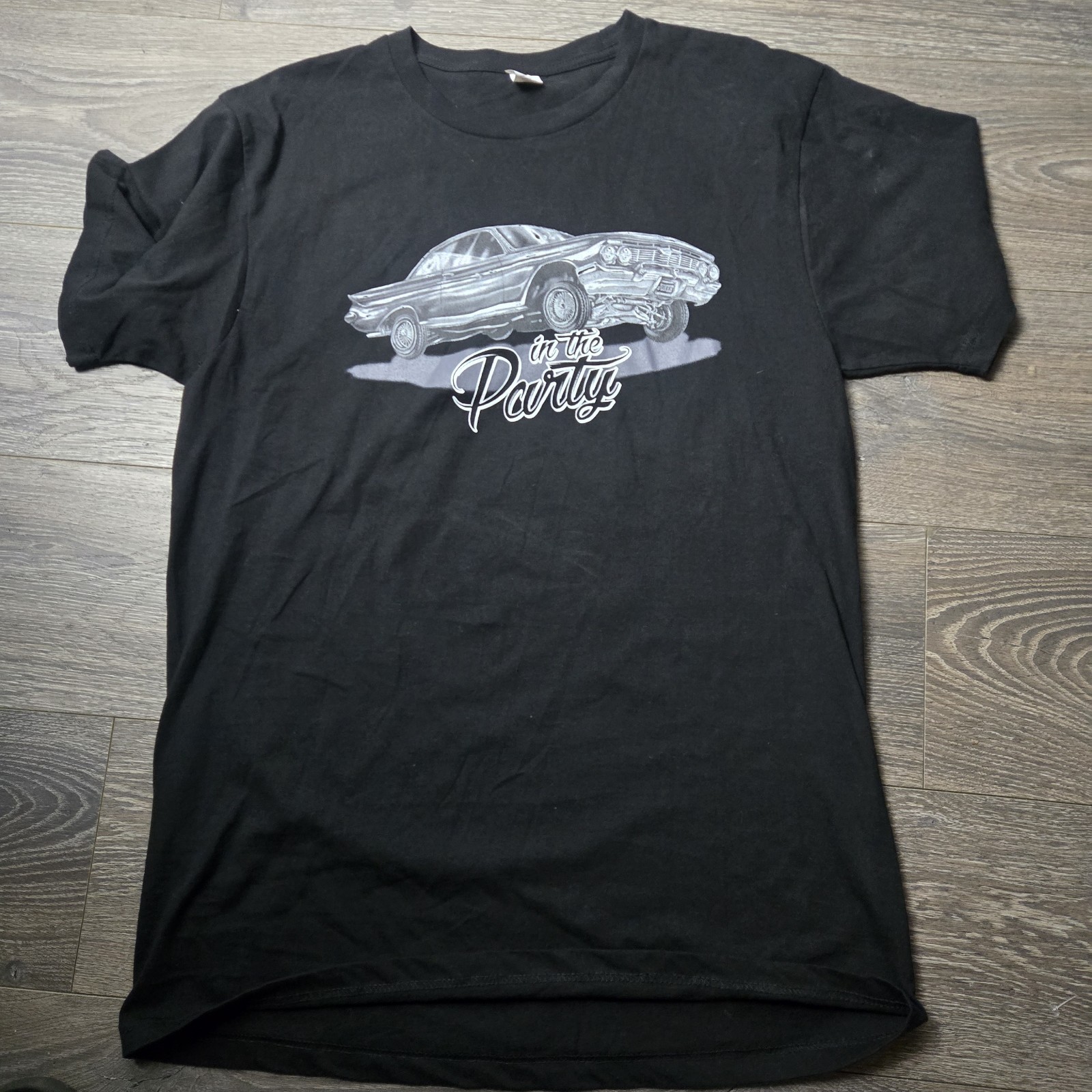 The product is a black XL T-shirt featuring a graphic design that represents a gangster car culture with elements of music and a party theme. The shirt is made of 100% cotton and has a short sleeve style, making it a comfortable and stylish choice for men who love car music and the homeboy aesthetic. The brand is assorted, and the design likely reflects a specific car culture and music genre influence. Perfect for those looking to express their unique style and love for cars and music in their clothing choices.