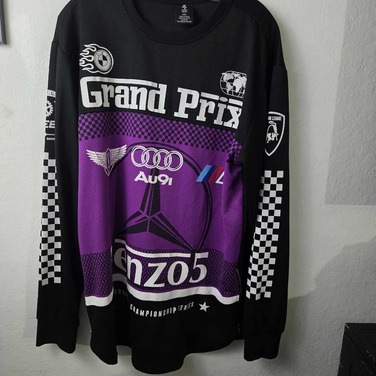 + Free ShippingThe Lavish Society Audi Grand Prix Racing T-Shirt is a stylish and sporty choice for men looking to make a statement with their clothing. This long sleeve shirt features a sleek black design with accents of purple and white, perfect for fans of sports and racing. Made from polyester, it is machine washable for easy care. The shirt is designed with a crew neckline and zipper accents, adding a touch of flair to the overall look. Perfect for casual wear or showing off team spirit, this t-shirt is a must-have for any racing enthusiast.