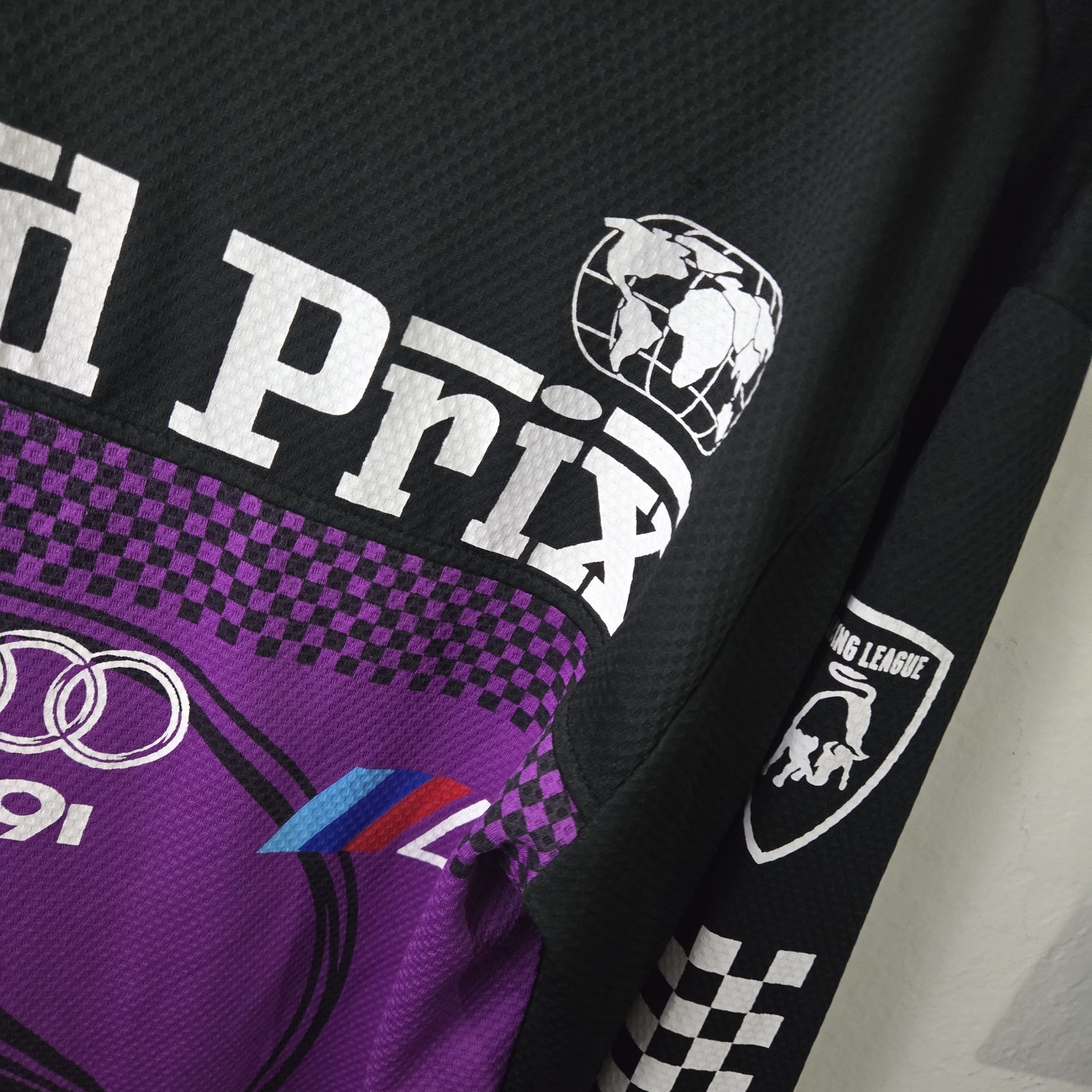 The Lavish Society Audi Grand Prix Racing T-Shirt is a stylish and sporty choice for men looking to make a statement with their clothing. This long sleeve shirt features a sleek black design with accents of purple and white, perfect for fans of sports and racing. Made from polyester, it is machine washable for easy care. The shirt is designed with a crew neckline and zipper accents, adding a touch of flair to the overall look. Perfect for casual wear or showing off team spirit, this t-shirt is a must-have for any racing enthusiast.