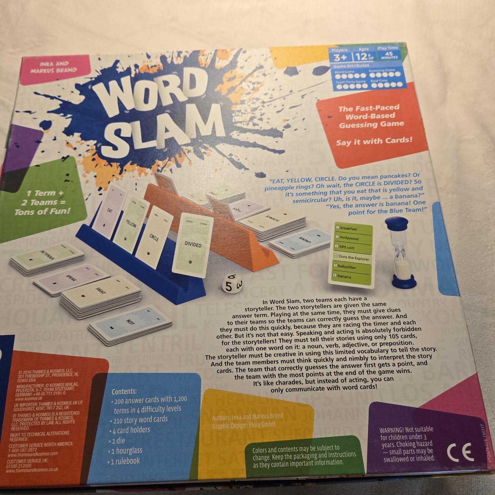 Word Slam by Thames & Kosmos is a board game that requires a minimum of 3 players and is recommended for ages 12 and up. This card game combines strategy with word play, making it engaging for both boys and girls. With a theme focused on strategy, players must use their critical thinking skills to outwit their opponents and be the first to empty their pile of cards. Word Slam is a modern and exciting addition to the world of board games, perfect for family game nights or gatherings with friends.